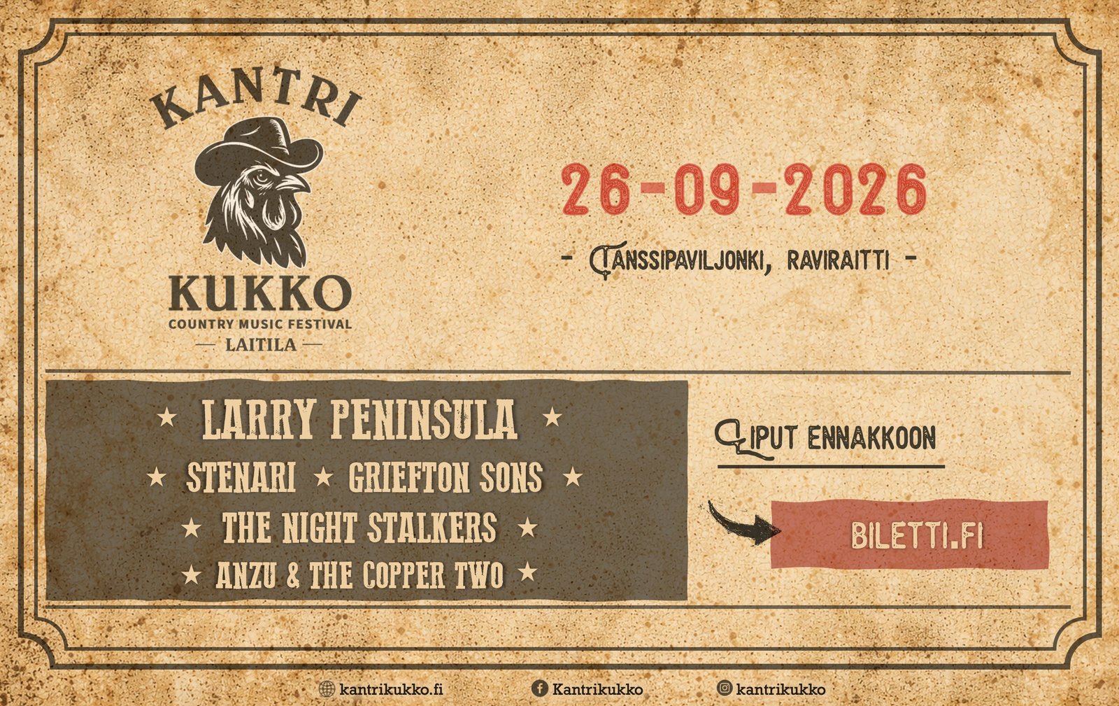 Lisätietoa tapahtumasta ja mm. ohjeet saapumiseen löydät osoitteesta kantrikukko.fi! Seuraa Kantrikukkoa myös Facebookissa ja Instagramissa, joissa ajankohtaista tietoa ja fiiliksiä.