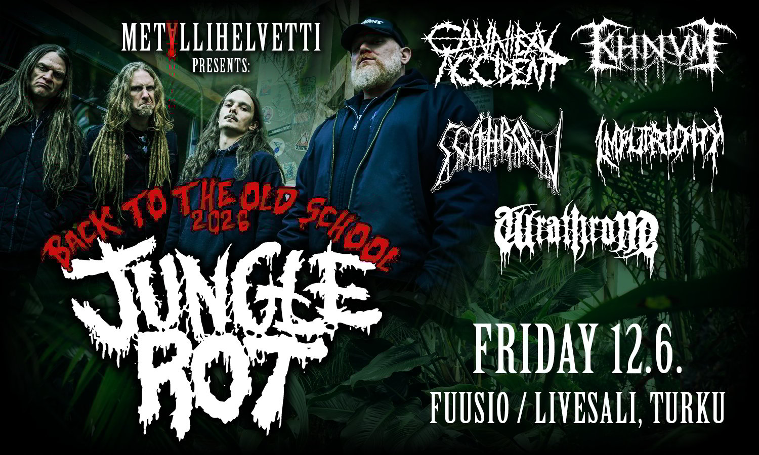 Metallihelvetti esittää: Jungle Rot (Usa), KHNVM (Ban/Ger), Cannibal Accident, Wrathrone, Scythrow, Imputridity