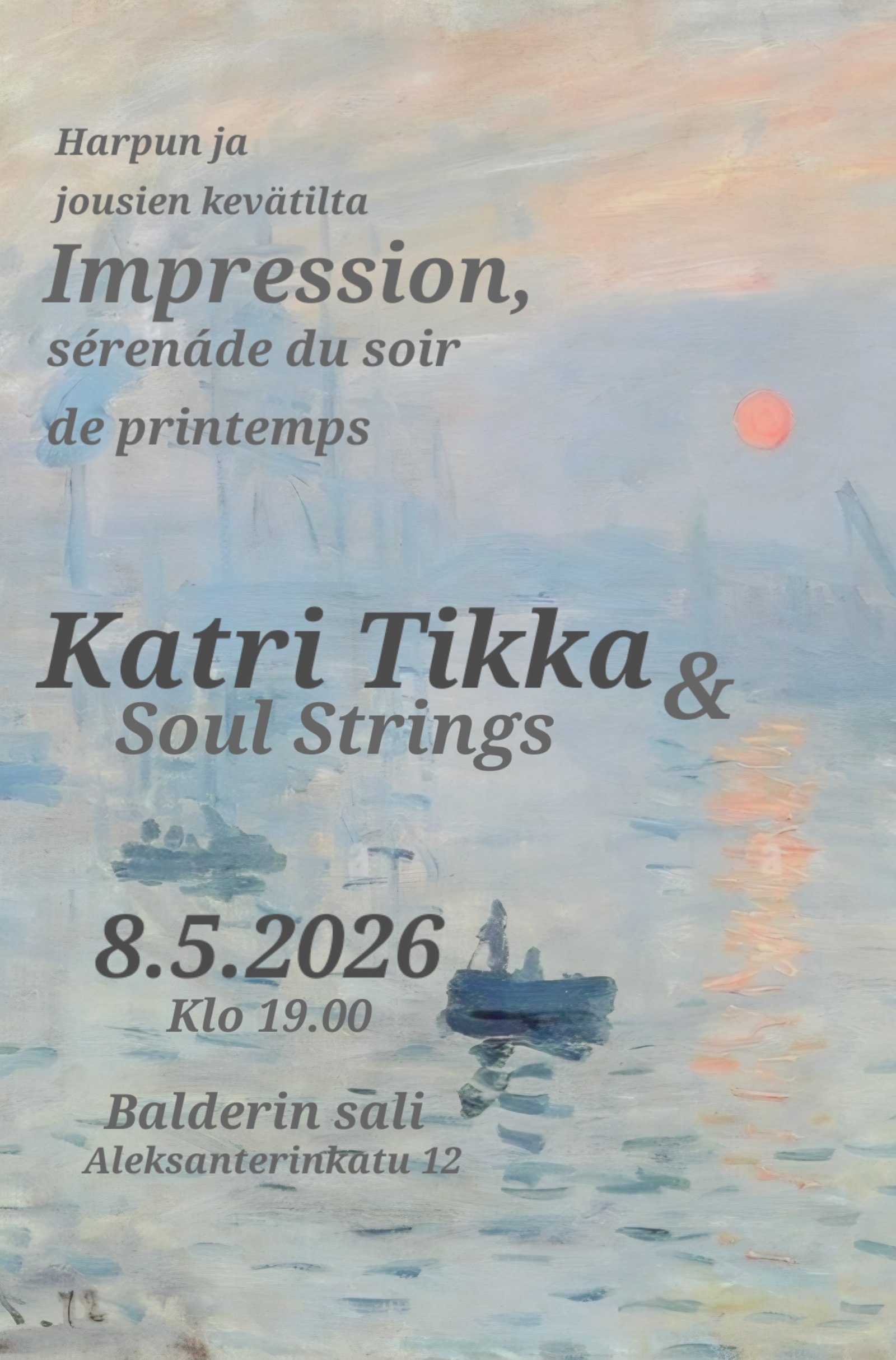 | Tapahtuma | Harpun ja jousien kevätilta | Impression, sérenáde du soir de printemps |