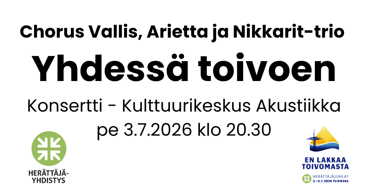 | Tapahtuma | Yhdessä toivoen – kuorokonsertti Chorus Vallis ja Arietta ft. Nikkarit-trio |